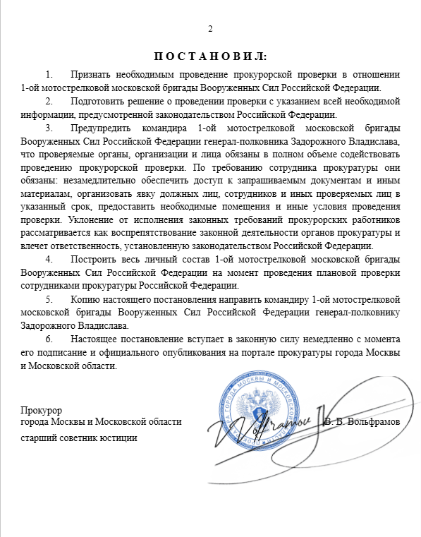 Постановление О проведении плановой проверки в отношении 1-ой мотострелковой московской бригады Вооруженных Сил Российской Федерации