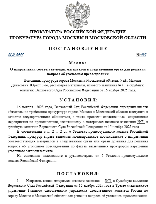 Постановление о направлении соответствующих материалов в следственный орган для решения вопроса об уголовном преследовании № 105